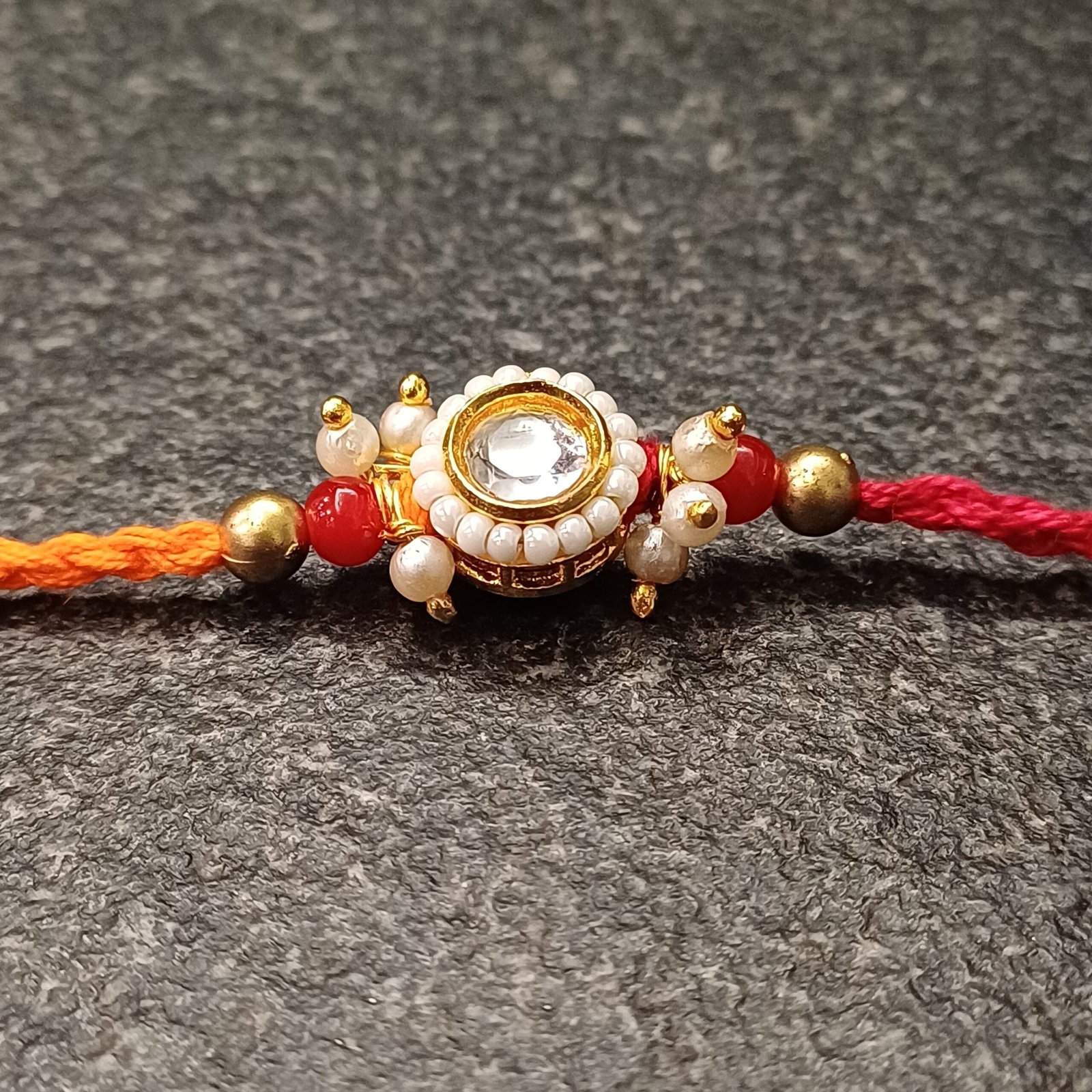 Celebrate the enduring bond of love with this stunning Golden Pearl Kundan Rakhi. Featuring a central kundan stone surrounded by mini pearl embellishments and red accents on dual-tone threads, this rakhi brings together elegance and tradition in perfect harmony. Ideal for brothers who appreciate classic craftsmanship and festive style, this rakhi is a graceful expression of sibling love.