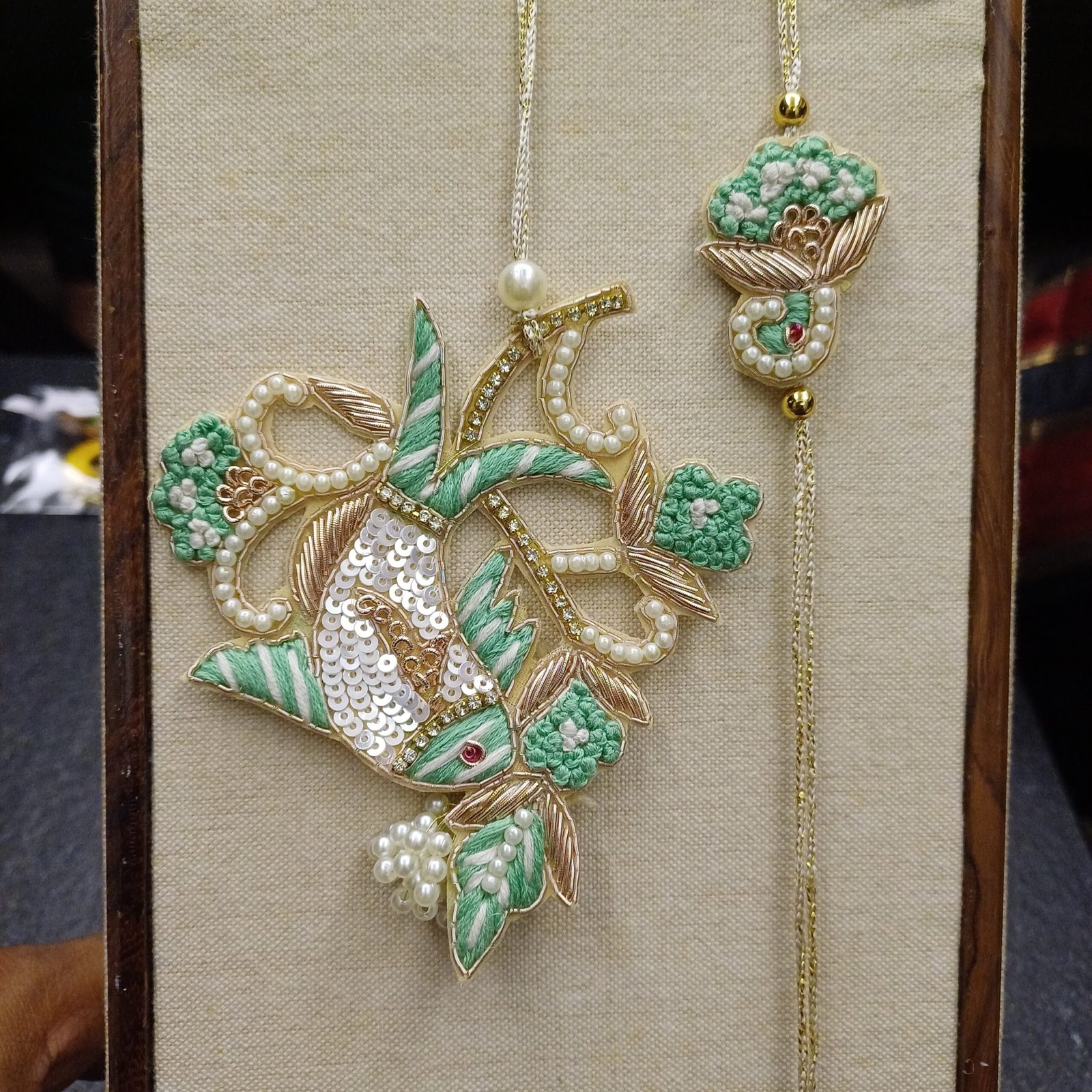 This beautifully handcrafted rakhi set includes a stunning bhabhi rakhi featuring a fish motif intricately embroidered with sequins, pearls, and zari, and a matching rakhi for the brother. The graceful interplay of pastel green, white pearls, and golden zari thread exudes refined sophistication and festive charm.